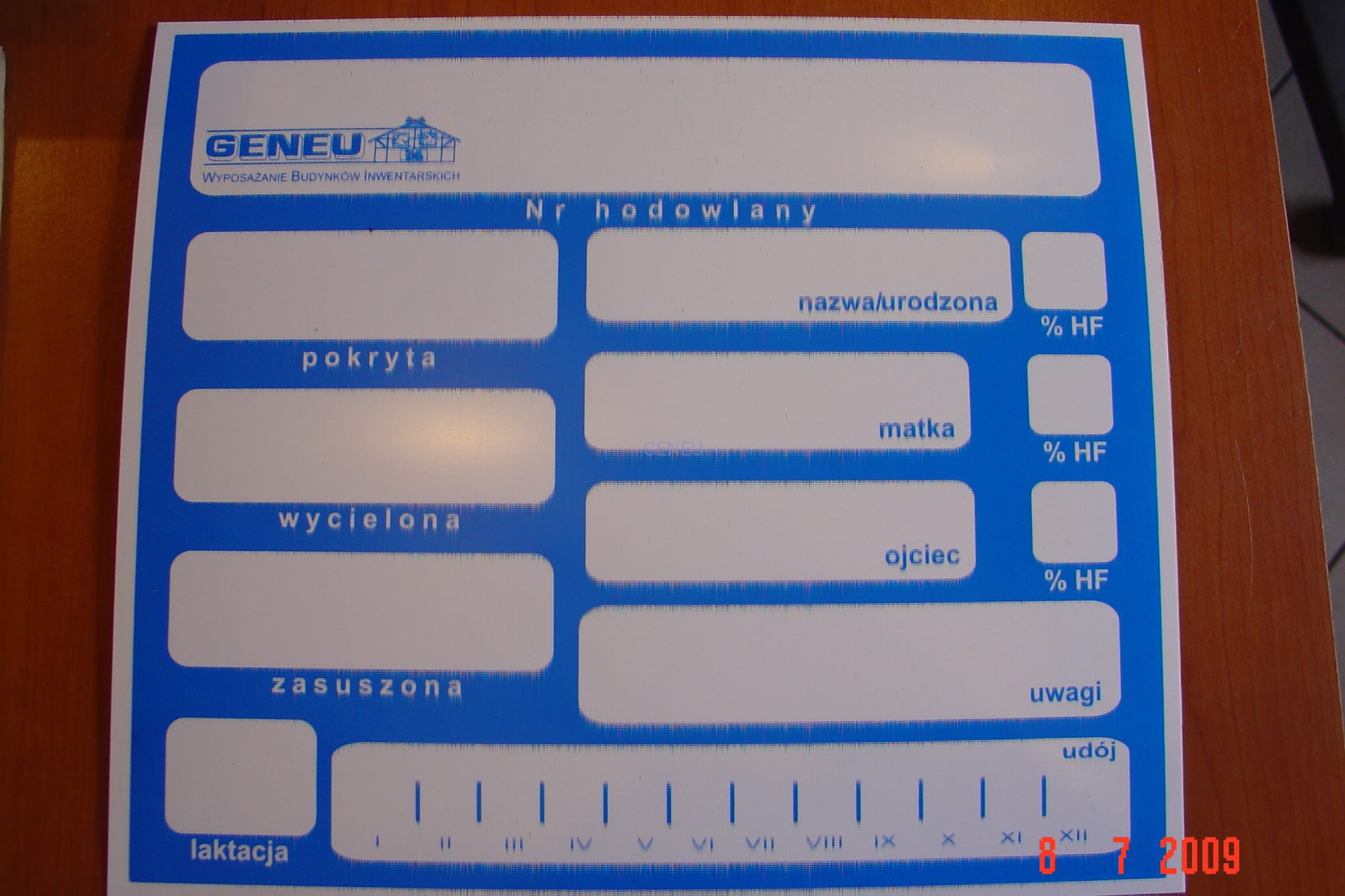 Tabliczka identyfikacyjna dla bydła. Wymiary 33,4 cm szerokości i 28,5 cm wysokości.